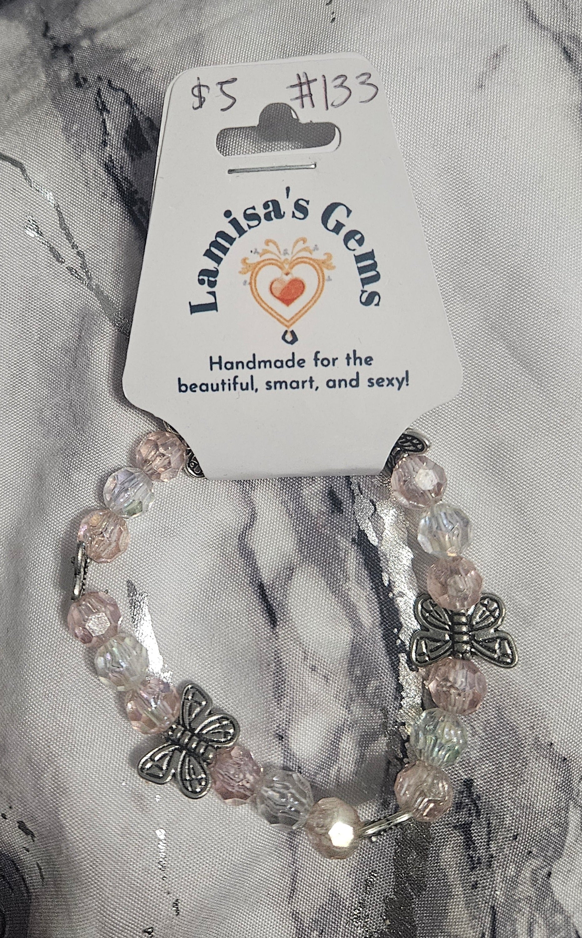 Pink and Clear crystal Butterfly Bracelet. 7in-8in Gossamer stretch cord