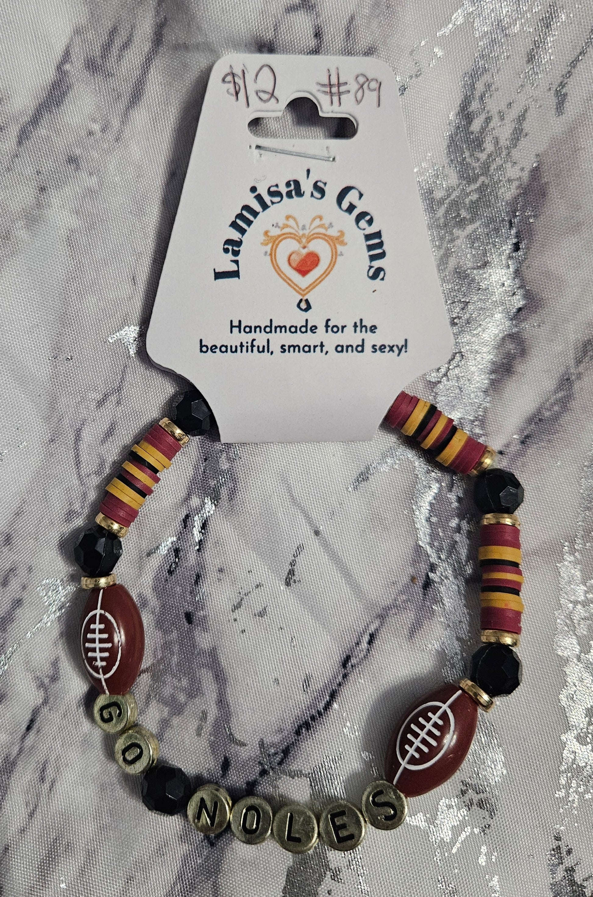 FSU Heishi Bracelet with Go Noles spelled out in gold beads also with black glossy beads and footballs. 7in- 9in Gossamer stretch cord