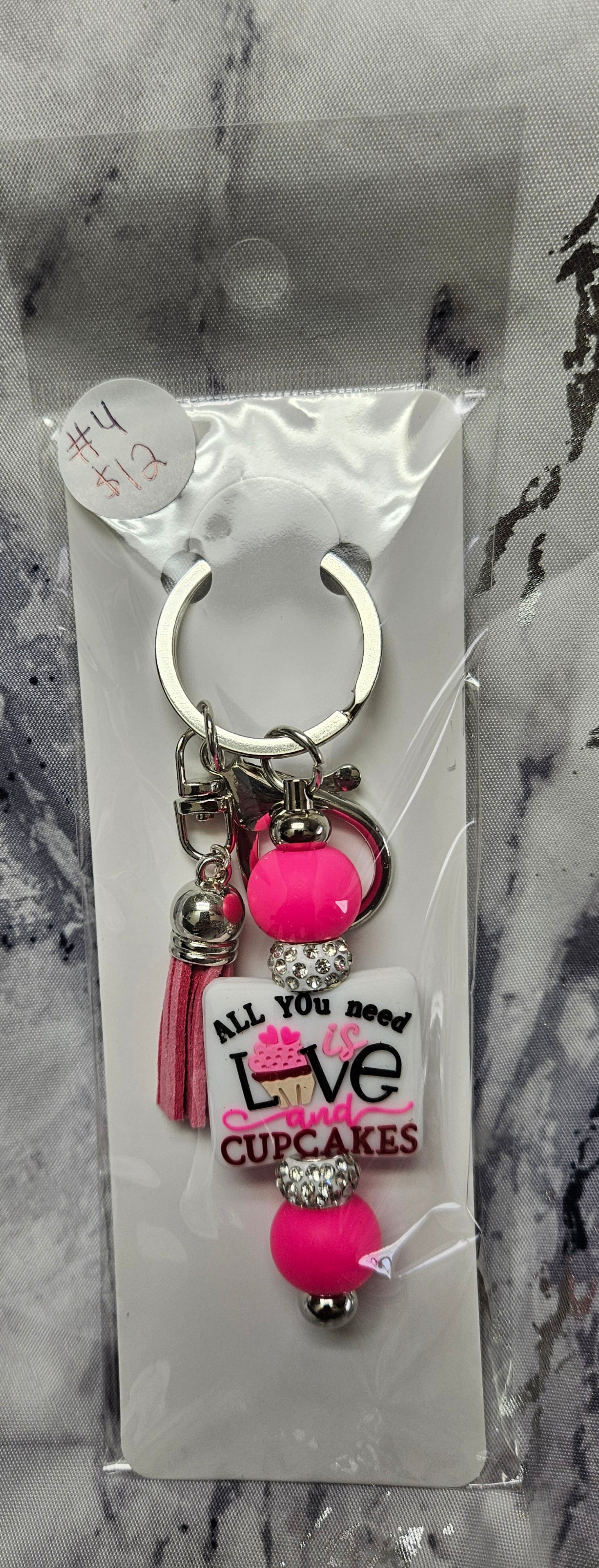 All You Need Is Love And Cupcakes Keychain with pink beads and Big Rhinestones and pink tassel