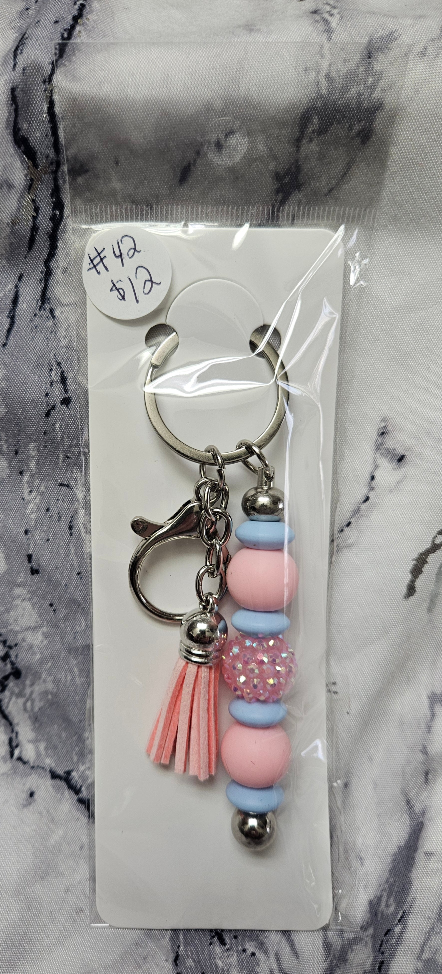 Pink Rhinestone Keychain with blue and pink beads and a pink tassel.