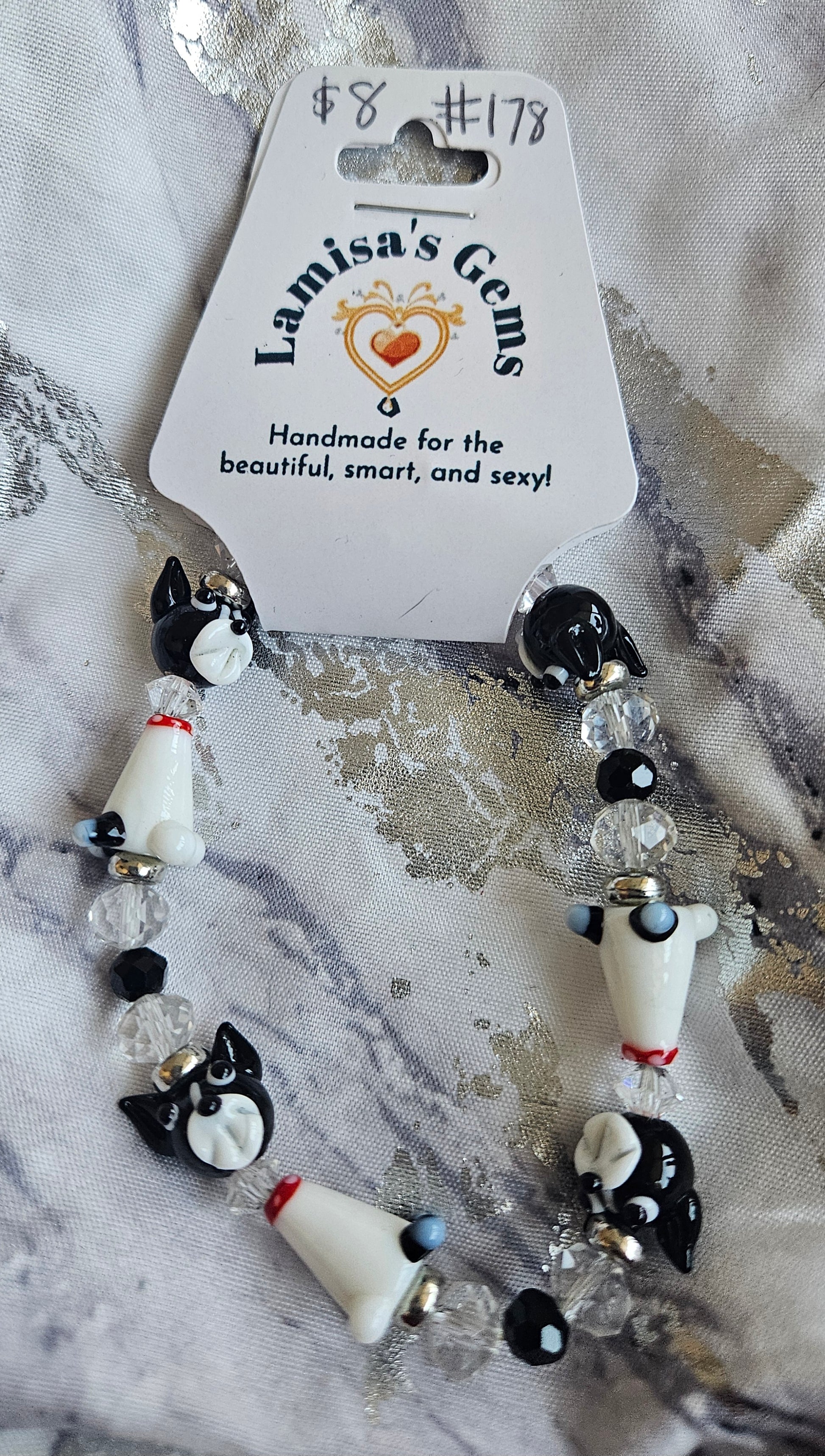 Puppy Bracelet with black and white Crystals and sliver accents. 6in-8in 0.8 stretch cord