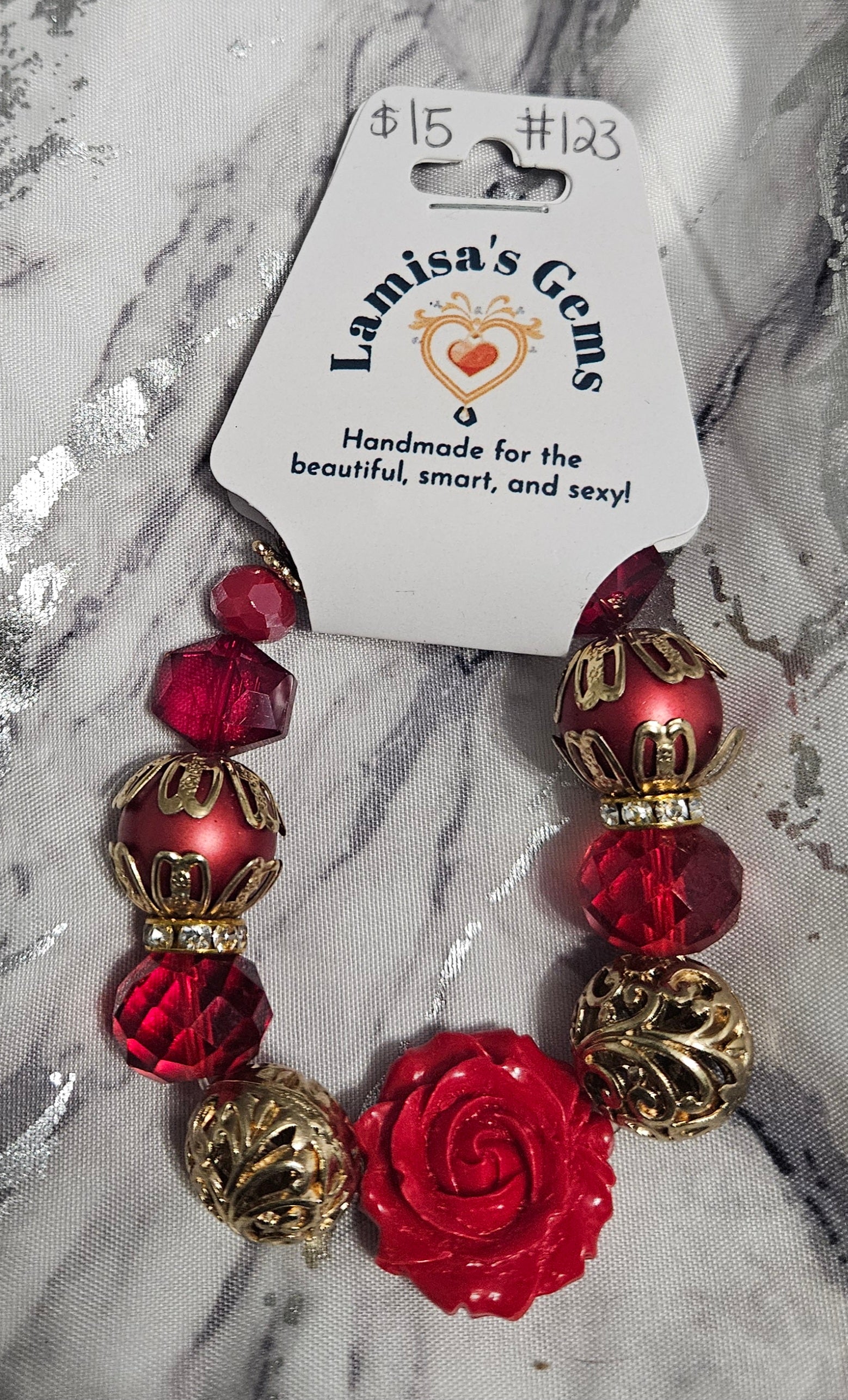 Rose Bracelet with big red crystals, gold Rhinestones and gold accents. 6in-7in. 0.8 stretch cord